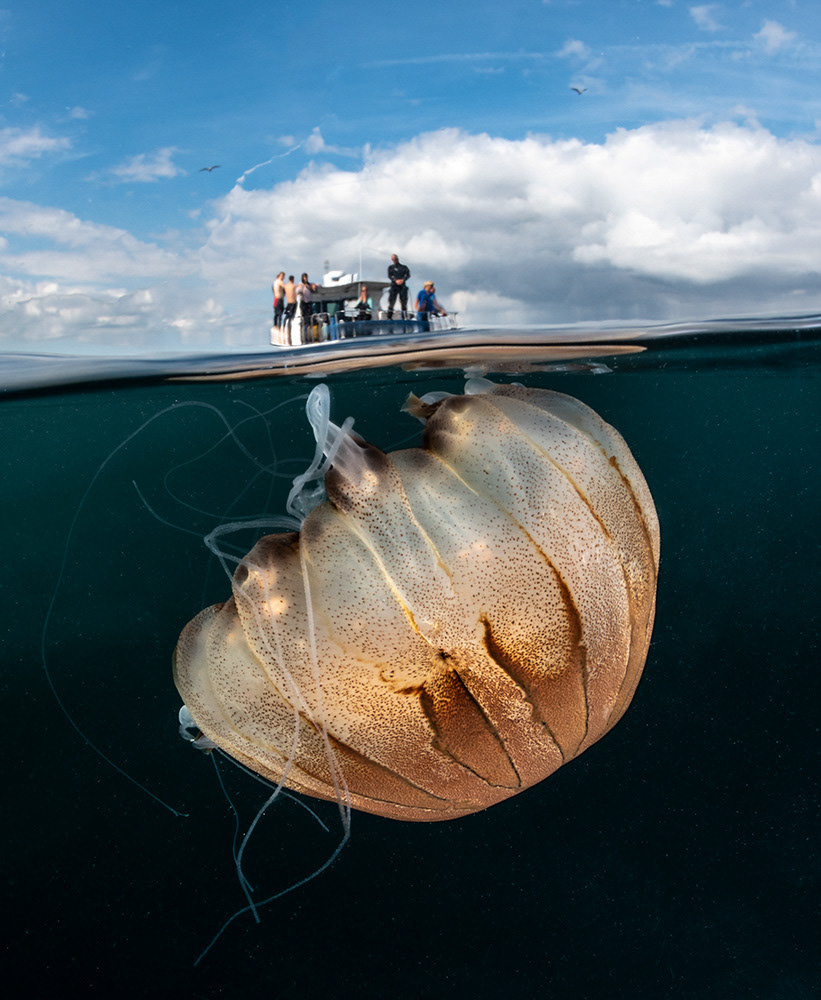 Compass Jelly fish (Chrysaora hysoscella) split level view with paddle boarder above the surface. Falmouth, Cornwall, UK.