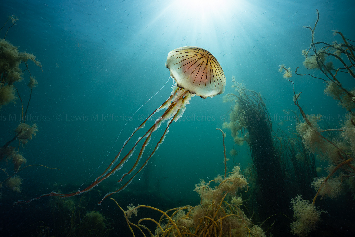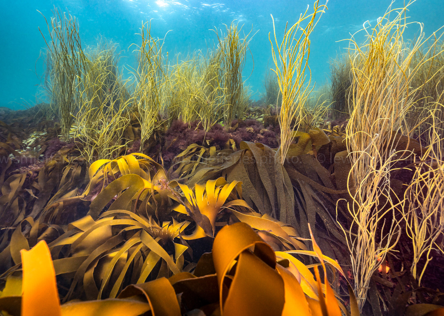 Blue Jellyfish (Cyanea lamarckii) above Golden kelp forest. Beneath Little Dennis fort. Falmouth, Cornwall. 2024
